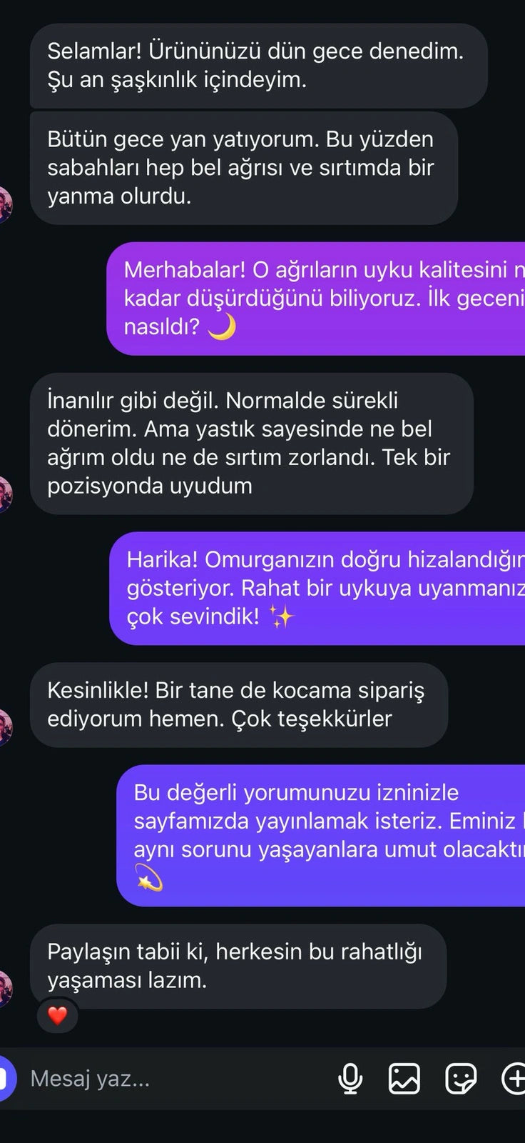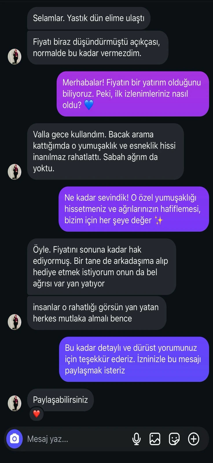 Birçok kullanıcı, yalnızca birkaç gece kullanım sonrasında belirgin rahatlama ve daha kaliteli uyku deneyimi yaşadığını belirtmektedir. Düzenli kullanımda ise gece boyunca daha dengeli ve konforlu bir uyku sağlanmasına yardımcı olur.